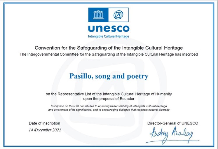El 14 de diciembre de 2021, la Organización de las Naciones Unidas para la Educación, Ciencia y Cultura, UNESCO, declaró al Pasillo Patrimonio Cultural Intangible de la Humanidad, un gran reconocimiento internacional para nuestra nuestra cultura e identidad.